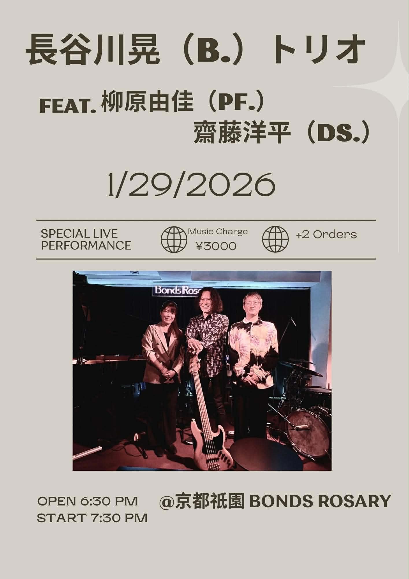 長谷川晃トリオat 京都祇園四条 Bonds Rosary イベント詳細 日付: 2026-01-29 7:30 PM – 9:30 PM 会場: Bonds Rosary 1月29日(木) 長谷川晃トリオat 京都祇園四条 Bonds Rosary 〈長谷川晃トリオ〉 長谷川晃(b) 柳原由佳(p) 齋藤洋平(ds) open18:30 start19:30 charge¥3,000 (+2order)