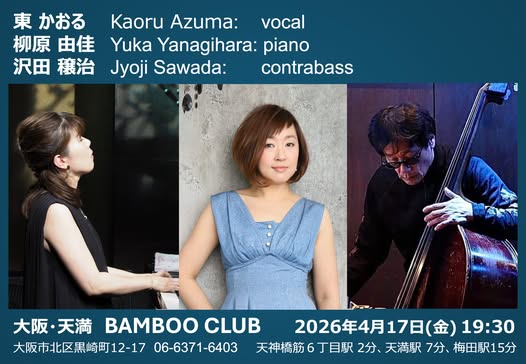 at 大阪天満 Bamboo Club イベント詳細 日付: 2026-04-17 7:30 PM – 9:30 PM 会場: bamboo club 4月17日(金) at 大阪天満 Bamboo Club 初組み合わせTrio! 東かおる(Vo) 柳原由佳(Pf) 沢田穣治(Bs) Start 19:30~ http://www.temma-bamboo.club/