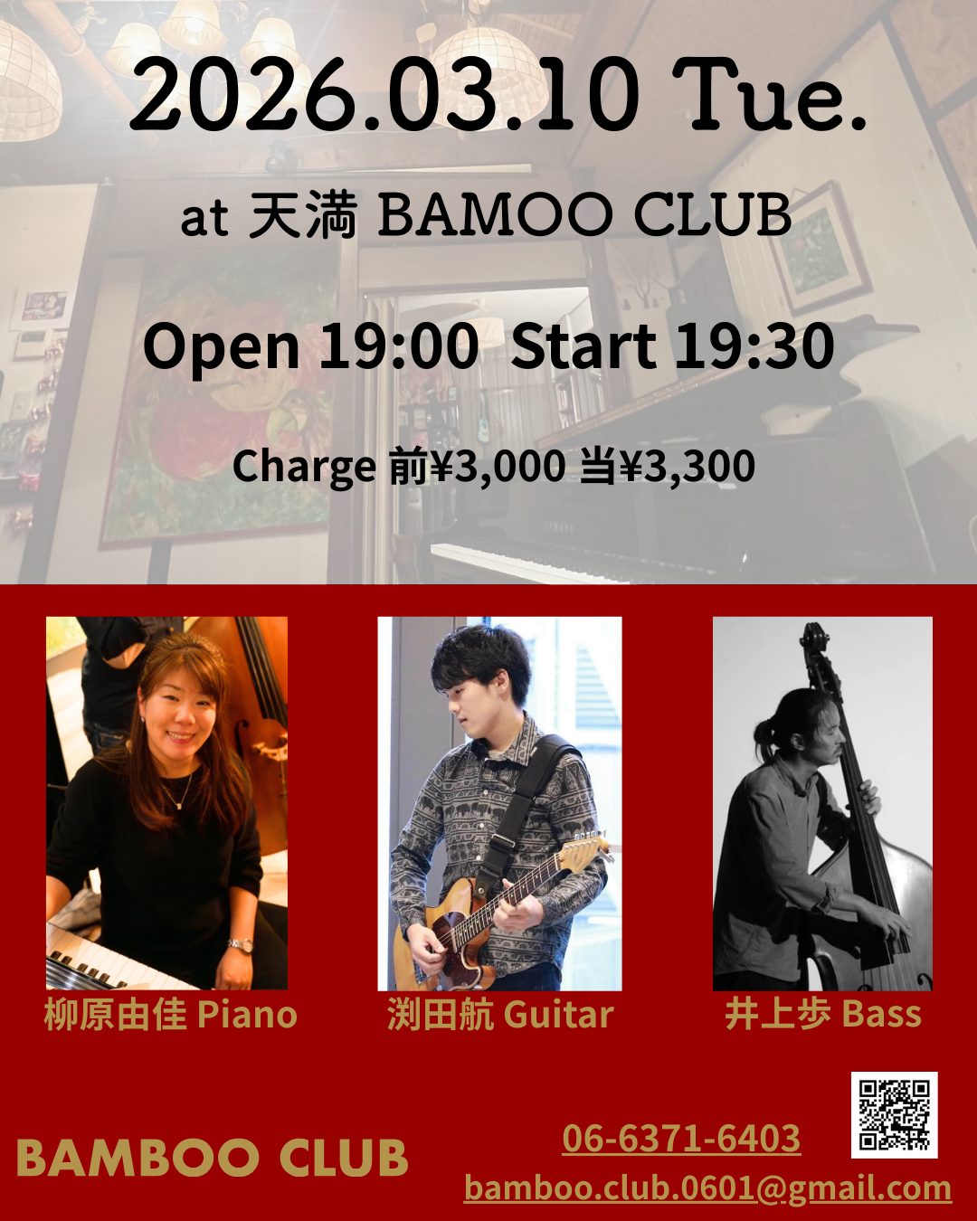 at 天満 Bamboo Club イベント詳細 日付: 2026-03-10 7:30 PM – 9:30 PM 会場: bamboo club 3月10日(火) at 天満 Bmboo Club 初Trio! 渕田航(Gt) 柳原由佳(Pf) 井上歩(Bs) Start 19:30~ Charge 予約¥3,000 当日¥3,300
